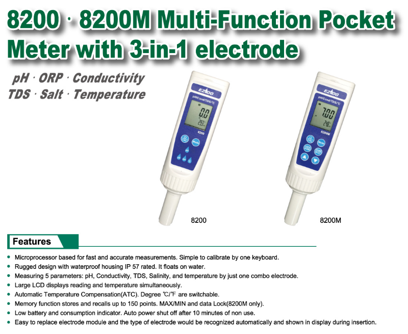 • pH/mV/Cond/TDS/Salt/Temp多合一水質測試儀,pH/mV/Cond/TDS/Salt/Temp Meter,EZ-8200,EZ-8200M,多功能水質檢測儀,Multi-function water quality tester,高極電子,GOnDo EzDo