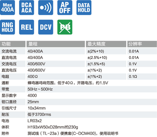 ■ 最大可測量交直流電流 400A , 最高解析度 0.01A